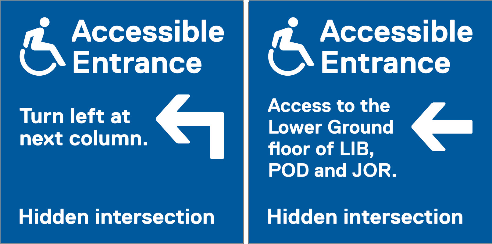 Additionally, in support of out commitement to accessibility and inclusivity, we modified exterior building IDs for older buildings where the main entrance is not accessile to users of mobility devices. We modified the accepted design to include directions to the nearest accessible entrance.